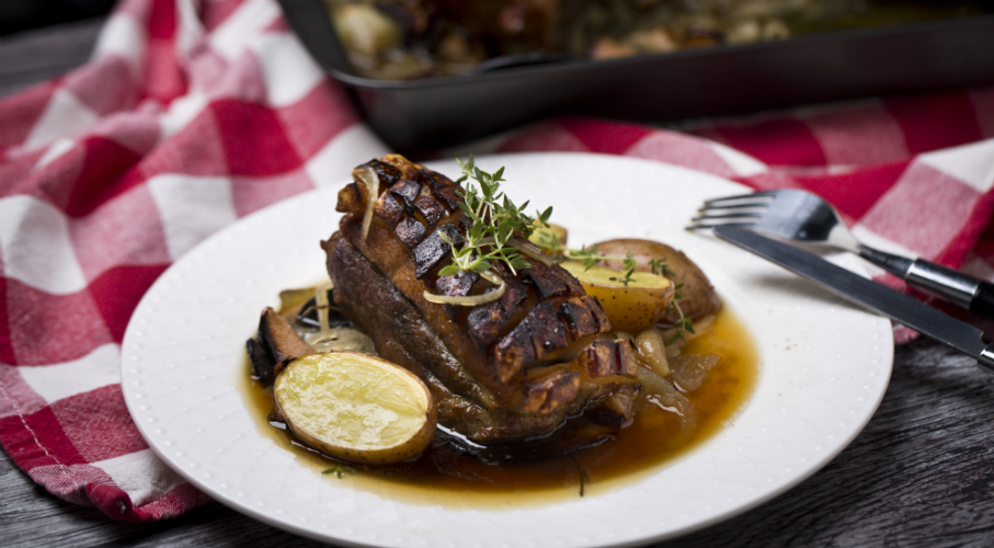 Az oldalast megmossuk, 4 részre vágjuk, leitatjuk és éles késsel bevagdossuk a bőrét. Megszórjuk sóval és borssal, és forró serpenyőben olajon hirtelen megkapatjuk a szeletek mind a 4 oldalát. Ezután sütőtálba helyezzük. A húsra szórjuk a vékony gerezdekre szeletelt almát, a félkarikára vágott hagymát, hozzáadjuk a babérlevelet és megszórjuk a fokhagymával és kakukkfűvel. Végül az egészet meglocsoljuk a sörrel és alaplével. A tálat lefedjük és kb. 1 órára a 200 °C-os sütőbe tesszük. Ezután levesszük a fedőt vagy fóliát, az oldalast meglocsoljuk a szafttal és további 30-40 perc alatt aranybarnára sütjük a 180 °C fokos sütőben.