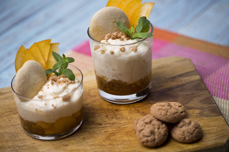 Poharak aljára morzsoljuk az amarettit. Ízlés szerint meglocsolhatjuk konyakkal. Egy serpenyőben cukrot karamellizálunk, és beletesszük a barackot néhány percre. Turmixgépbe tesszük a mascarponét, a cukrozatlan tejszínt, valamint a porcukrot, és sűrűbb állagú krémet készítünk belőle. Az amarettire szedünk a karamellizált barackból, és a tetejére teszünk a mascarponés krémből.