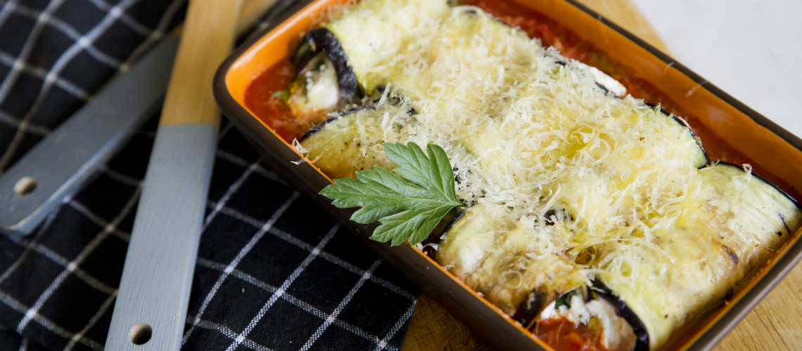 A ricottás keveréket padlizsánszeletekbe tekerjük, sütőedénybe tesszük, a salsával leöntjük, megszórjuk parmezánnal és megsütjük. Friss, fehér pirított bagettel tálalható.