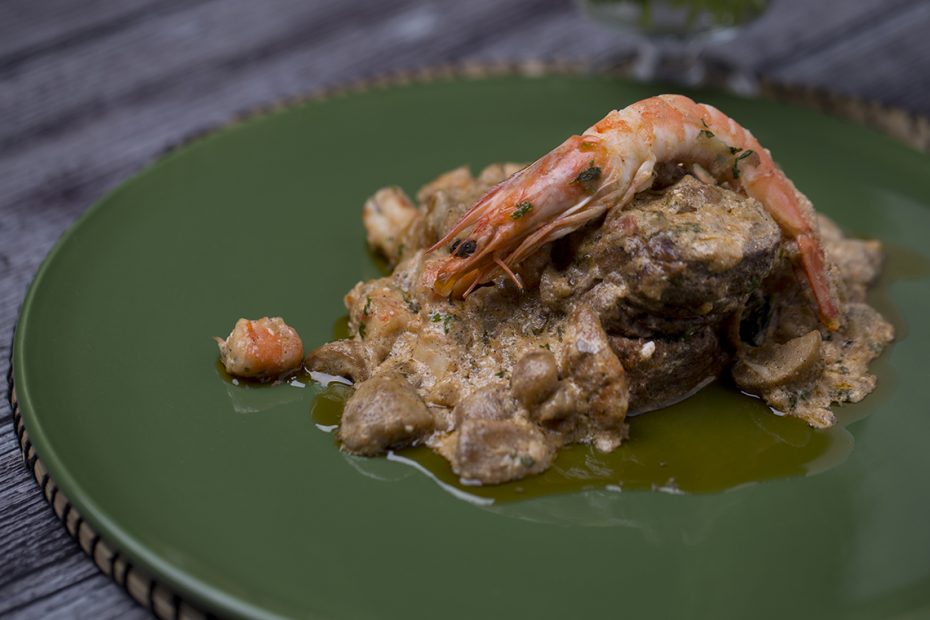 A gombát megpároljuk a zsiradékon megfuttatott hagymával. Egy másik serpenyőben a rákot is megpároljuk fokhagymával és petrezselyemmel. A bélszínt kisütjük olajban. Amikor kész, hozzáadjuk a párolt gombát, valamint a garnélarákot, és keverünk bele némi tejfölt is. Paradicsomszósszal nyakon öntve tálaljuk.
