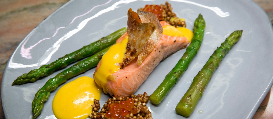 A lazacot felszeleteljük, óvatosan levágjuk róla a bőrt, hiszen ebből ropogóst szeretnénk készíteni. Besózzuk, olajon átsütjük, a bőrös felét helyezve a serpenyőbe. Pihentetjük, majd rozmaringos vajon tovább sütjük, folyamatosan locsolgatva.