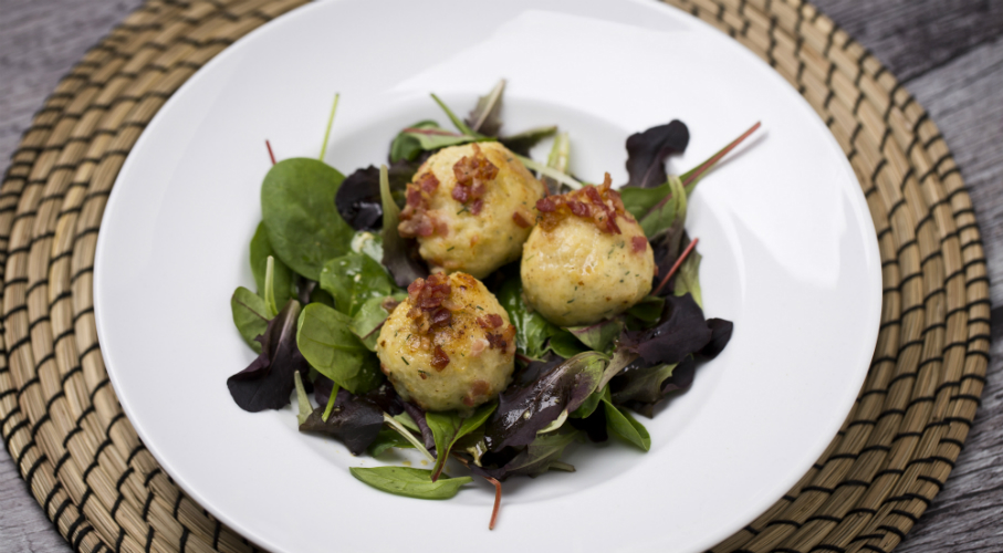 A héjában főtt, áttört burgonyát alaposan összedolgozzuk a liszttel, a zsírral és a tojással. Sózzuk és fűszerezzük borssal, valamint friss vágott kaporral. Kétféle gombócot formázunk belőle. Egy kisebbet a levesbetétnek és nagyobbat az előételhez. Forrásban lévő sós vízben 5-6 perc alatt puhára főzzük, majd a nagyobb gombócokat lecsöpögtetve, kevés vajban megpirítjuk. Olívaolajat citromlével, mustárral, sóval, őrölt borssal kikeverünk és ezzel az öntettel locsoljuk a leveles salátákat. Ennek a tetejére helyezzük a pirított gombócokat, majd ízlés szerint szórhatjuk apró kockára vágott, sült baconnel.