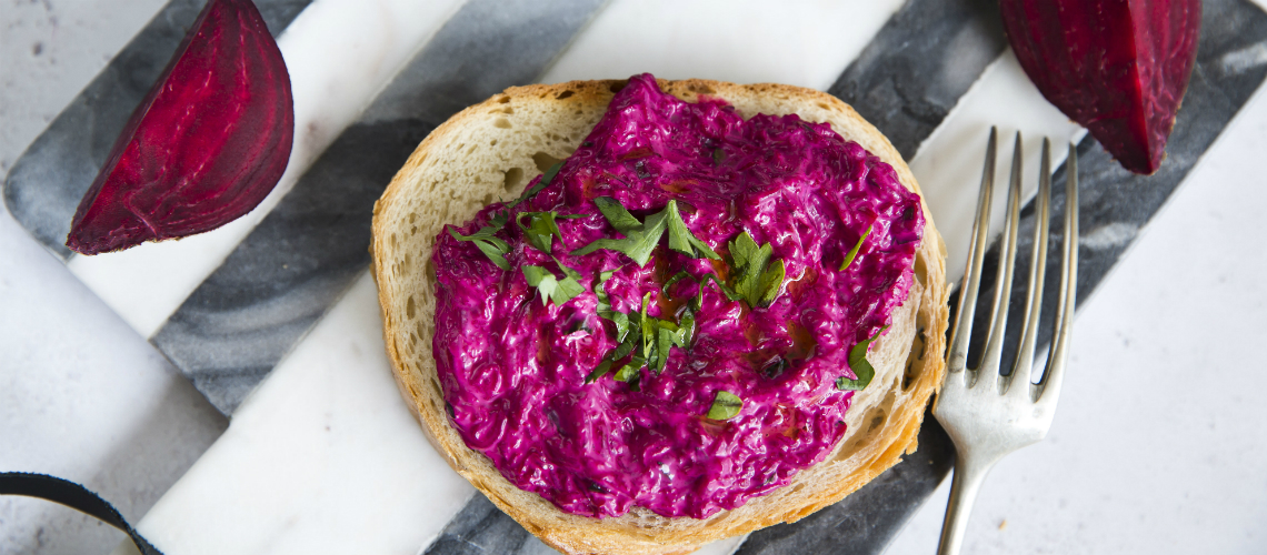 Megsütjük a céklát sóval, borssal és olívaolajjal fóliában. Apró darabokra vágjuk vagy lereszeljük. A fokhagymát is puhára sütjük fóliában, majd együtt pépesítünk mindent. Bekeverjük majonézzel, tejföllel, zöldfűszerekkel, sózzuk, borsozzuk.