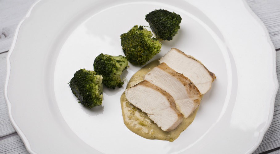 Az egész csirkemellet sózzuk, borsozzuk, kérget sütünk neki, majd sütőben, kevés vajjal 150 fokon készre sütjük. A visszamaradt zsiradékban szeletelt póréhagymát pirítunk, felöntjük száraz fehérborral, mézzel és beleforraljuk a mustárt. Sózzuk, borsozzuk, majd a végén tejszínt adunk hozzá. Vajban párolt brokkolival kínáljuk.