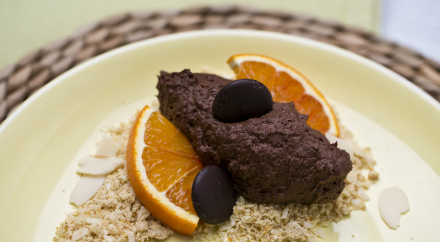 A feldarabolt csokit, a cukorral és a tojásokkal egy tálba tesszük és vízgőz fölött csípősre melegítjük. A vízgőzről levéve hozzáadjuk a kávéport. Kihűtjük és a habbá vert tejszínnel lazítjuk. Egy késes aprítóban összekeverjük a zabkekszet, mandulát és a reszelt narancshéjat. Ez lesz az alap, erre pakoljuk a csokimousse-t. Tálalásnál narancsszeletekkel díszíthetjük.