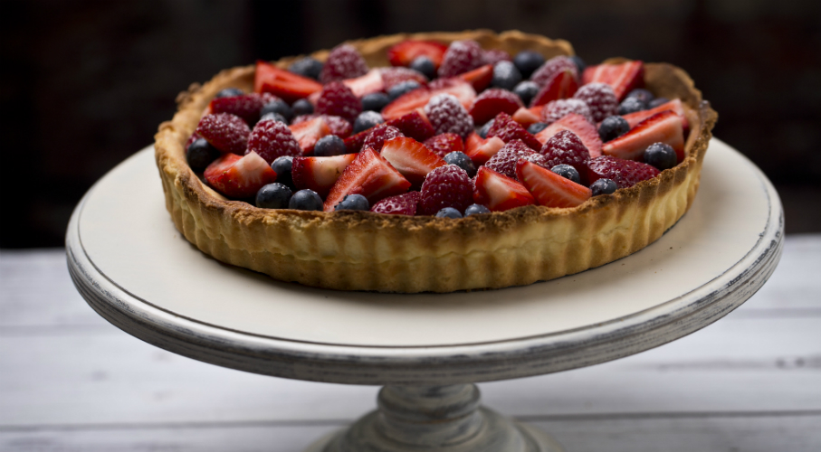 A lisztet és a porcukrot elmorzsoljuk a kockára vágott hideg vajjal. Hozzáadjuk a tojások sárgáját és összegyúrjuk, míg összeáll. Fóliába csomagoljuk és pár órára a hűtőszekrénybe tesszük pihenni. Majd a tésztát kinyújtjuk és a piteformába egyengetjük, belenyomkodjuk. Nehezékkel 190 fokon elősütjük a tésztát. Közben a felforralt tejszínt a feldarabolt csokira öntjük és összekeverjük, míg a csoki elolvad, belekeverjük a vajat és a glükózszirupot is. A csokis masszát az elősütött tésztára öntjük, hűtőben kihűtjük, míg megszilárdul. Piros bogyós gyümölcsökkel díszítjük.