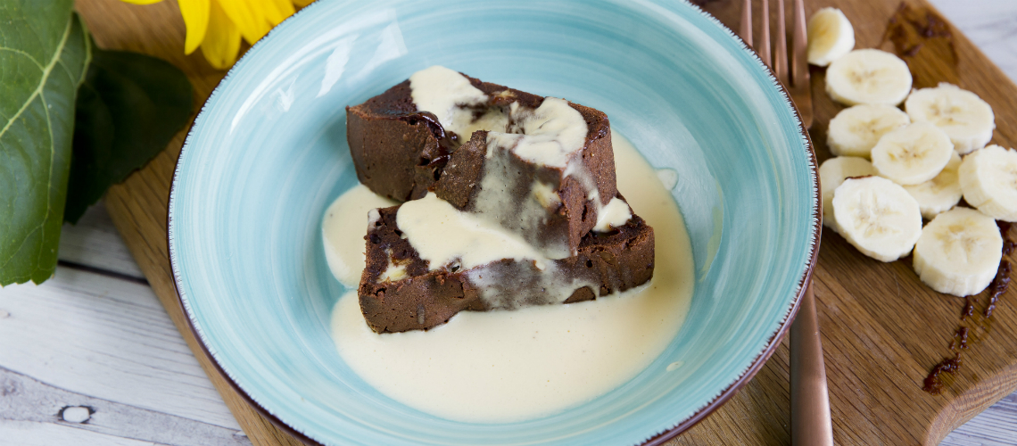 Megolvasztjuk a vajat és a csokoládét, hozzáadunk kakaót, tojást, lisztet és cukrot, és elkészítjük a tésztát. Beletesszük az apróra vágott banánt, formába öntjük és 175 fokon a kívánt állagúra sütjük. Közben előkészítünk egy sabayont: a tejet, a tejszínt, a tojást, a cukrot és az apróra vágott tonkababot gőz fölött krémmé habarjuk, majd hagyjuk szobahőmérsékletre hűlni.