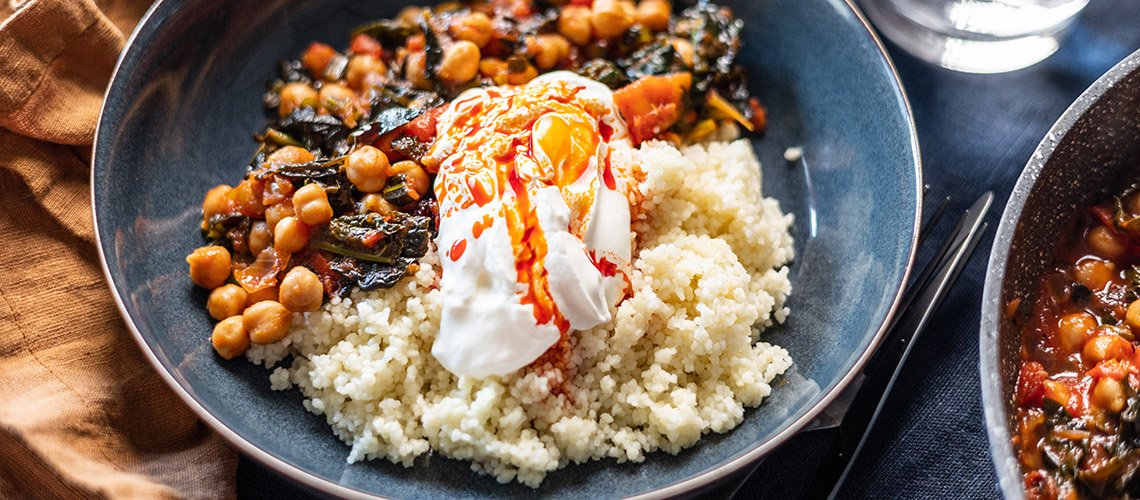 Kuszkusz szal vagy főtt rizzsel találjuk. A tetejére lecsepegtetett görög joghurtot és chili olajat is tehetünk.