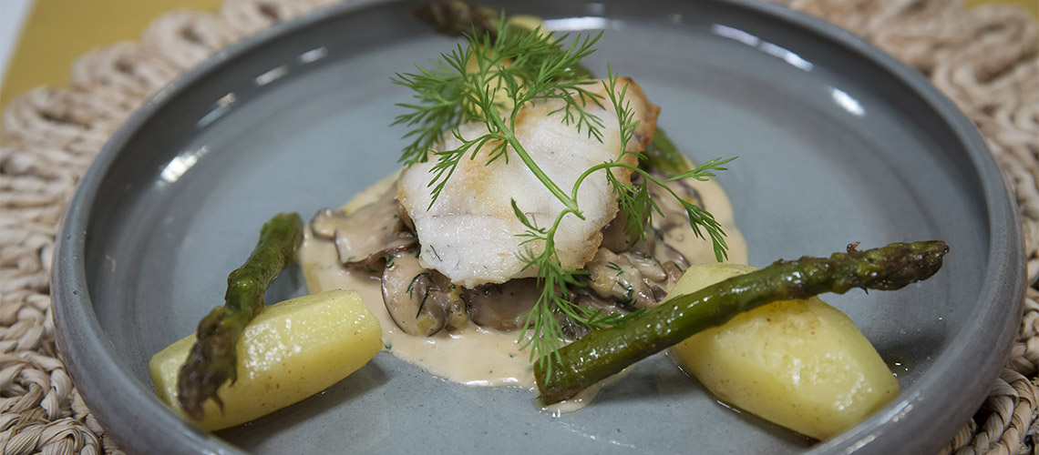 Olvasztott vajban megpirítjuk a szeletelt póréhagymát és a gombát. Sózzuk, borsozzuk, hozzáadjuk a külön sütött rákfarkakat. Felöntjük tejszínnel, fehérborral, majd beforraljuk. A legvégén friss vágott kaporral fűszerezzük. A fogasfiléket sózva, borsozva pirosra sütjük. Tálaláskor citromos vízben főtt burgonyát és párolt zöldspárgát adunk mellé.