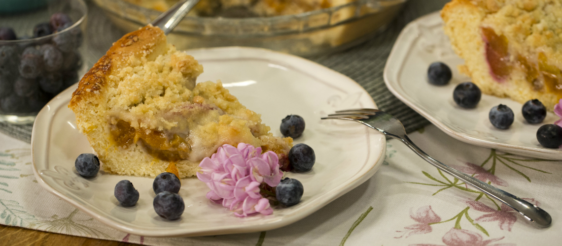 Egy tálba tesszük a lisztet, tojást, a reszelt zsírt, a kovászt egy kevéske tejjel. A tésztát összegyúrjuk, egyből a tepsire tesszük, vagy egy formába (nem kell kikenni, beszórni, a tészta eléggé zsíros), amiben kézzel kinyomkodjuk a széléig, hogy pereme is legyen. A tésztára tesszük a morzsával megszórt gyümölcsöket. A 180 °C fokra előmelegített sütőben aranybarnára sütjük.