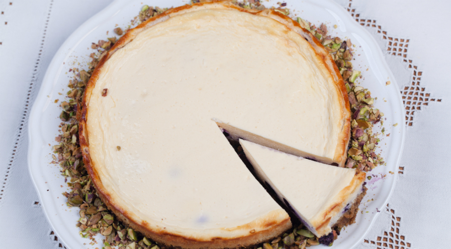Egy 20 x 30 cm-es tepsit kibélelünk sütőpapírral úgy, hogy a papír kilógjon a tepsiből – ezzel fogjuk majd kiemelni a süteményt, ha elkészült. A kekszalaphoz a sós, pörkölt pisztáciát közepesen durvára vágjuk, a kekszet mozsárban összetörjük és egy tálban összekeverjük. Hozzákeverjük az olvasztott vajat és a cukrot. A sütőforma aljára nyomkodjuk. Megszórjuk megmosott, szárazra törölt áfonyával. A krémsajtot robotgépben kerémesre keverjük a cukorral. Egyenként hozzákeverjük a tojásokat, majd a lisztet is. Hozzáadjuk a tejfölt, épp csak addig keverjük, amíg homogén lesz, hogy ne keverjünk bele levegőbuborékokat. A kekszalapra öntjük. 170 fokra előmelegített sütőbe tesszük és 50 perc alatt készre sütjük. A sütőből kivéve hagyjuk kihűlni, kivesszük a formából és legalább 2 órára, de jobb, ha egész éjszakára, a hűtőbe tesszük.