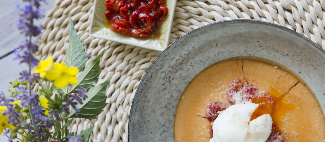 A csicseriborsót turmixgépbe tesszük és krém állagúra aprítjuk, lime-lével, ecettel, yuzuval ízesítjük, és parmezánt szórunk rá. Fenyőmaggal, tojással és korianderrel tálaljuk.