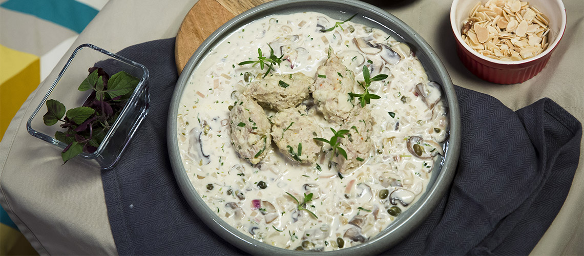 Adjuk hozzá a vajat és a tejszínt, majd habosítsuk. Kapribogyóval és húsgombóccal tálaljuk.