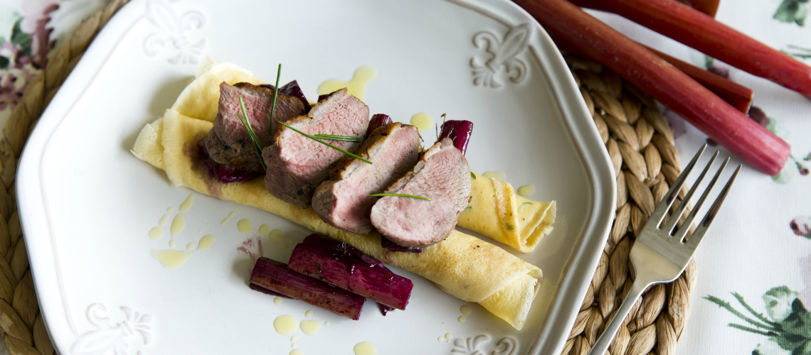 Megtisztítjuk a kacsamellet. Készítsük elő a rebarbarát, megpirítjuk, vörösbort öntünk alá, s hozzáadjuk a szegfűszeget és a kakukkfüvet. Sűrűre forraljuk el. A melleket rózsaszínűre sütjük egy serpenyőben. Zöldfűszerekkel, fokhagymával ízesítjük. A palacsintához tejszínt, tojátst, lisztet, sót, borsot és petrezselyemzöldet keverünk be. Olajban, serpenyőn kisütjük. A kacsamellett sós palacsintán, rebarbararaguval tálaljuk.