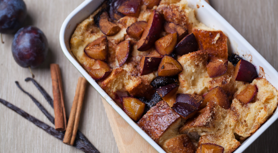 A tejszínt, tejet, kissé felvert tojásokat, a cukrot és a vaníliarúd kikapart magját összekeverjük egy tálban. A kalácsot nagyobb falatnyi darabokra vágjuk és leöntjük a tojásos masszával. Összekeverjük s állni hagyjuk, hogy megszívja magát. Egy hőálló tálat kivajazunk és beleöntjük a kalácsos masszát. Rákanalazzuk a szilvalekvárt, majd a tetejére rendezzük a kimagozott szilvákat. Az egészet megszórjuk fahéjjal elkevert barna nádcukorral, majd 180 fokon kb. 35 percig sütjük, amíg kissé felpuffad és aranyszínűre sül.