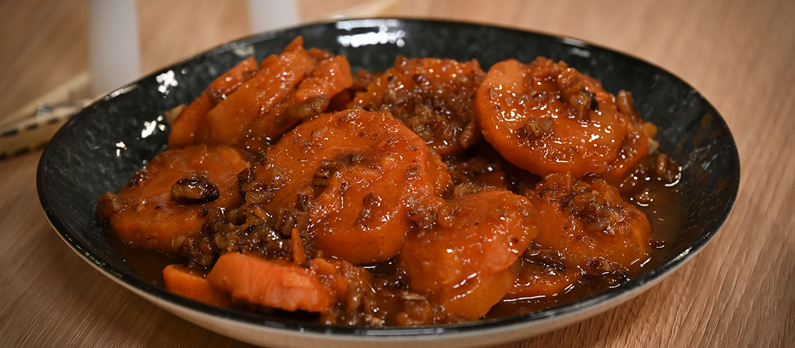 Elkészítés: Az édesburgonyát meghámozzuk és vastag szeletekre vágjuk. Egy nagy edénybe hideg vízbe tesszük a szeleteket és felforraljuk, 10 percig forraljuk. Az édesburgonya szeletek ekkor még félig kész állapotban vannak. Kiszedjük a szeleteket és félre tesszük. A főzővízbők egy nagy bögrényit félte teszünk, a többi vízre nincs szükség. Az edényben felolvasztjuk a vajat, hozzáadjuk a cukrot. Hozzá reszeljük a narancshéját. Amikor a cukor barnulni kezd, belefacsarjuk a narancs levét is, hozzáöntjük a félre tett főzővizet és beletesszük a félig főtt édesburgonya karikákat. Úgy tegyük bele a burgonya karikákat, hogy a lé elfedje őket és fedő alatt körülbelül 20 perc alatt annyira megfőzzük, hogy már majdnem szétesnek a karikák. Tálaláshoz egy nagy tálba szedjük. Az edényben maradt édes szószhoz hozzáadjuk a fahéjat és a pekándiót és egyet rottyantunk rajta, majd a kiszedett burgonyákra öntjük ezt az édes szószt.
