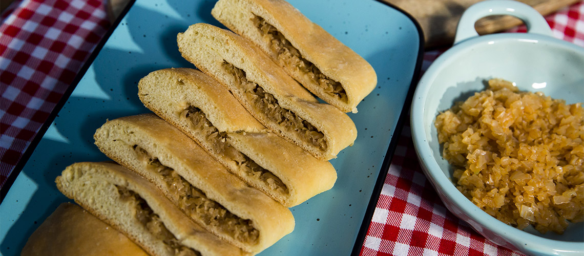 Megtöltjük a dinsztelt káposztával, majd a tésztát ráhajtjuk a töltelékre. Kikent vagy sütőpapírral bélelt tepsibe tesszük. A tetejét villával néhány helyen megszurkáljuk.