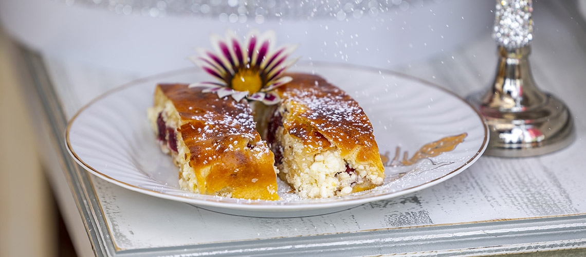 1 kg lisztből, 2,5 dkg élesztőből, 2 tojássárgájából, 2 dl langyos tejből 20 dkg cukorral kelt tésztát dagasztunk. Mikor a tészta már elválik a kéztől és kis hólyagocskák lesznek benne, akkor egy meleg helyre fél órára félretesszük. Mikor megkelt kb 20 dkg-os bucikat formálunk belőlük. A túrós töltelékhez 1 kg túrót, 20dkg cukrot, 1 csomag vaníliás cukrot, és reszelt citrom héját összekeverünk. A bucikat kinyújtjuk, a túrós tölteléket belehelyezzük, megszórjuk magozott meggyel, majd feltekerjük, tepsibe tesszük, a tetejét megkenjük tojással és a 180 fokos sütőben kb 30-40 perc alatt megsütjük.