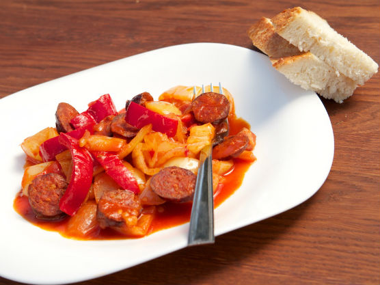 A felforrósított serpenyőben megpirítjuk az apróra vágott füstölt szalonnát és vöröshagymát. Ezután hozzáadjuk a kockákra vágott húsos szalonnát, a karikákra vágott kolbászt és az erős paprikakrémet, majd jól elkeverjük. Hozzáadjuk a zöldségeket: a félfőre vágott vöröshagymát, a csíkokra vágott paprikákat, és 15 percig pároljuk. Ezt követően hozzáadjuk a cikkekre vágott paradicsomot, valamint az átpasszírozott paradicsomlevet. Sózzuk, hozzáadjuk a fűszerpaprika keveréket is, majd 15 perc alatt összefőzzük. Forrón tálaljuk.