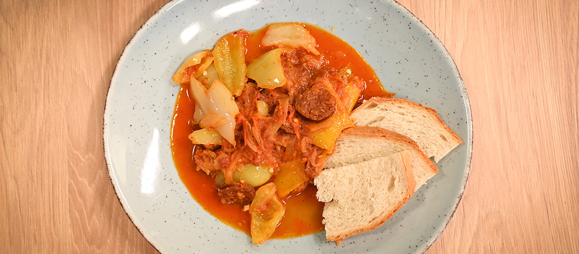 A szalonnát felkockázzuk, a kolbászt karikákra vágjuk. A hagymát hosszúkásra szeleteljük, a paradicsomokat felkockázzuk. A paprikát összetépkedjük. A szalonnát lepirítjuk pörcig, közben a hagymás is mellé pirítjuk. Utána beletesszük a paradicsomot és egészen pürésre főzzük. Majd beletesszük a kolbász karikákat és alaposan összerottyantjuk az egészet. Amikor késznek érezzük, akkor kerül bele a paprika, mit éppen csak megfőzünk, hogy még egy kis roppanóssága maradjon.