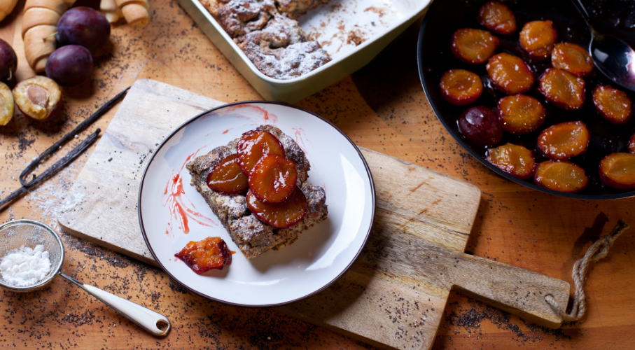 A tej-tejszín keverékébe belekaparjuk a vaníliarúd magjait és melegíteni kezdjük. A tojásokat szétválasztjuk, a sárgáját a cukorral jó habosra keverjük és egy keveset hozzáadunk a melegített tejszínes tejből. Kikeverjük és az egészet visszaöntjük a tejes keverékhez, simára keverjük és alacsony lángon, folyton kevergetve kicsit besűrítjük (de nem hagyjuk felforrni!), végül leöntjük vele a kb. 1 cm vastagra szeletelt kifliket. Megszórjuk a mákkal, alaposan átforgatjuk és félretesszük. A tojások fehérjét közepes habbá verjük és hozzákeverjük a mákos kiflihez. 4 kisebb, kivajazott és darált mákkal kiszórt hőálló tálkát megtöltjük a mákos keverékkel. Sütőben 200 fokon kb. 15 percig sütjük, és rögtön tálaljuk. Egy kisebb serpenyőben karamellizáljuk a cukrot. Amikor borostyán színű, hozzáadjuk a kimagozott szilvákat és az almalevet. Addig hevítjük, amíg az almalé szirupos lesz és a szilva összeesik.. A gubára kanalazva tálaljuk.