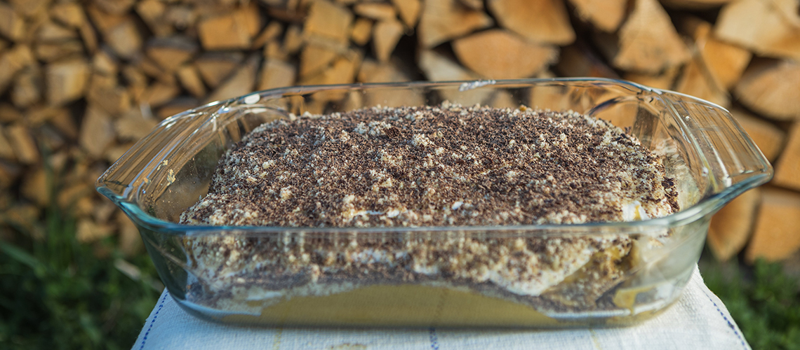 Összeállítás: A megsült és kihűlt piskótát helyezzük egy tálra. Kendjük meg a kihűlt krémmel, majd tegyük rá a habbá vert tejszínt. Szórjuk meg darált dióval és reszelt csokoládéval.