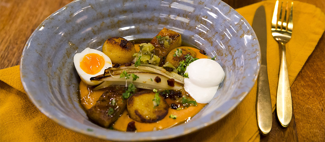 Elindítjuk a paprikáskrumpli alapot. Megsütjük a kolbászmorzsát, majd vajon elkészítjük a konfitált shalotta hagymát. Majd elkészítjük a 6 perces tojásokat, a tejfölhabot és előkészítjük a húsmártást. Végül megsütjük a mangalica kolbászt és tálalunk.