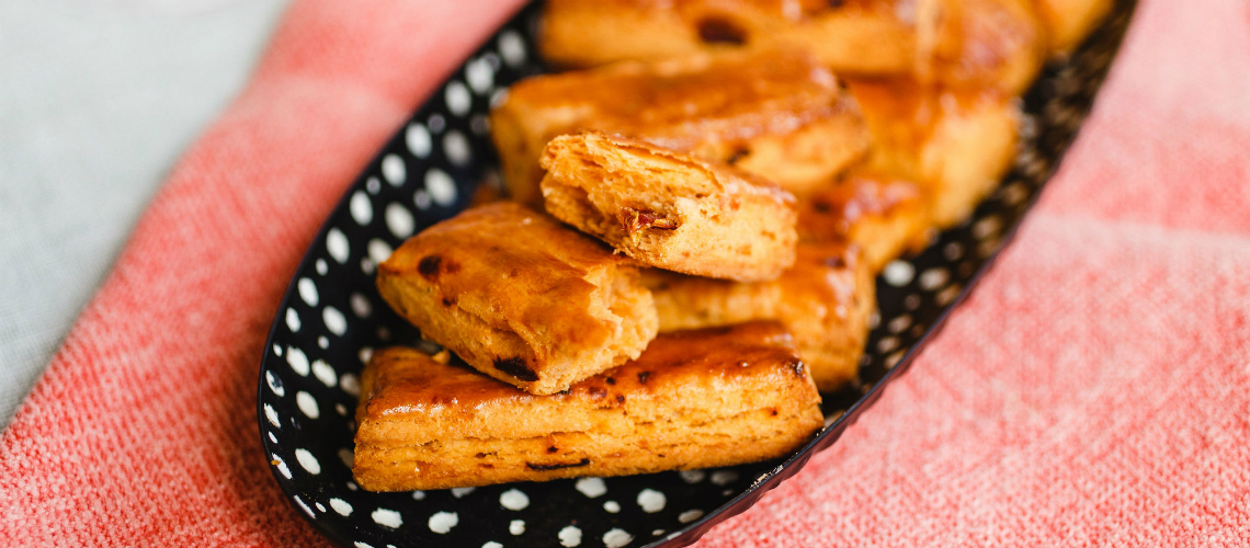 A sütőt 200 fokra előmelegítjük. A tésztát lisztezett munkalapra tesszük, átgyúrjuk és 1,5 centi vastagságú téglalappá nyújtjuk. Rudakat vágunk belőle, sütőpapírral leterített tepsire tesszük és megkenjük kissé felvert tojással. 15 perc alatt készre sütjük a forró sütőben.