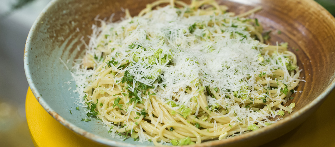 A pagodakarfiolt apróra vágjuk és vajban megpirítjuk, hozzáadjuk a halszószt és a lime levét. A garnélarákot forró serpenyőben gyorsan megpirítjuk és a karfiolhoz adjuk, majd chilivel fűszerezzük. A tésztát al dente megfőzzük az alaplében. Ízlés szerint összekeverjük és pecorinóval tálaljuk.