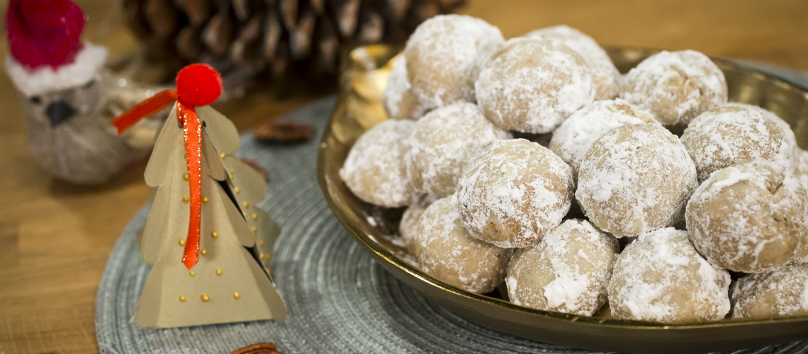 A hozzávalókból keksztésztát gyúrunk, fóliába csomagolva min. 1 órára behűtjük. A tésztából 20 grammos gyolókat formázunk, sütőpapíros tepsin 180 fokon 15 perc alatt megsütjük és még melegen a vaníliás porcukorba fogatjuk a golyókat.