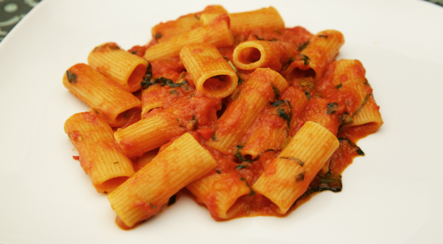 Jól megsózzuk a vizet, ha forr, feltesszük főni a rigatonit. Egy serpenyőben kevés olíva olajban megpároljuk az apróra vágott hagymát, és hozzáadunk egy gerezd fokhagymát egészben. Pár percig hagyjuk a fokhagymát puhulni, majd kiszedjük a serpenyőből. Hozzáadunk a hagymához az apró kockára vágott paprikákat, végül a paradicsomot. Ízlés szerint sózzuk, belerakjuk a friss, apróra vágott bazsalikomot, és kb. 20 percig együtt főzzük. A tésztát félkész állapotban leszűrjük, majd a szószban főzzük készre. Ha elkészült, levesszük a főzőlapról a serpenyőt, és beleszórjuk a parmezán sajtot . Melegen tálaljuk.