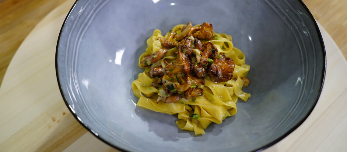 A rókagombából, tejszínből és újhagymából készült szósz már önmagában is isteni, nem kell feltétlenül még konyakkal is flambíroznunk. Az egyszerű házi tészta pedig különösen finommá teszi ezt az ételt.