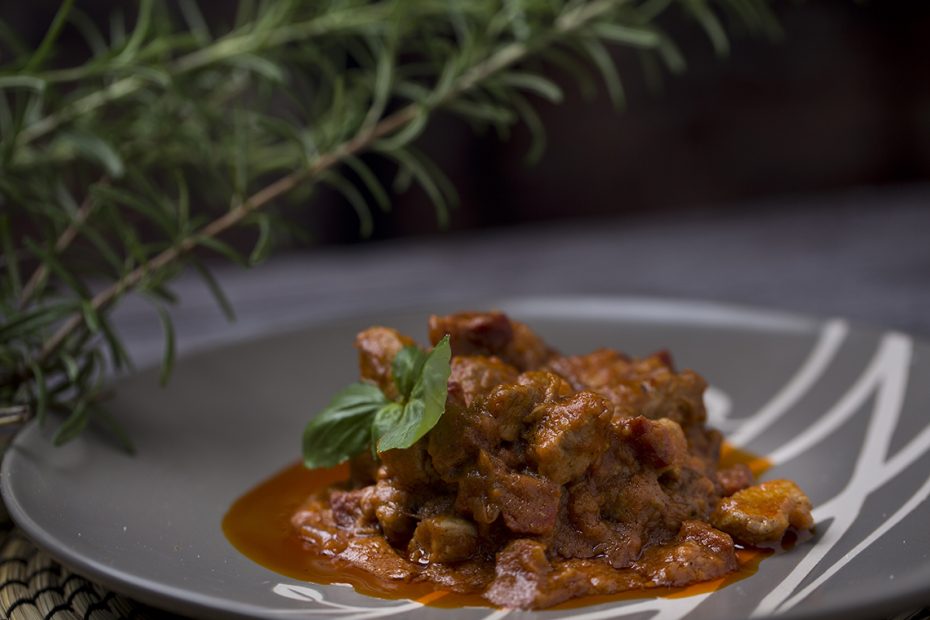 A sertéshúst kockákra vágjuk, a chorizot pedig felszeleteljük. Egy serpenyőben olívaolajon megfuttatjuk a hagymát, utána beletesszük a chorizot és az előzőleg lisztben megforgatott sertéshúst. Főzés közben meglocsoljuk fehérborral. Amikor a bor teljesen elpárolgott, szórunk bele borsikafüvet, rozmaringot, füstölt fűszerpaprikát, valamint öntünk rá paradicsomszószt, és 15 percig készre főzzük.