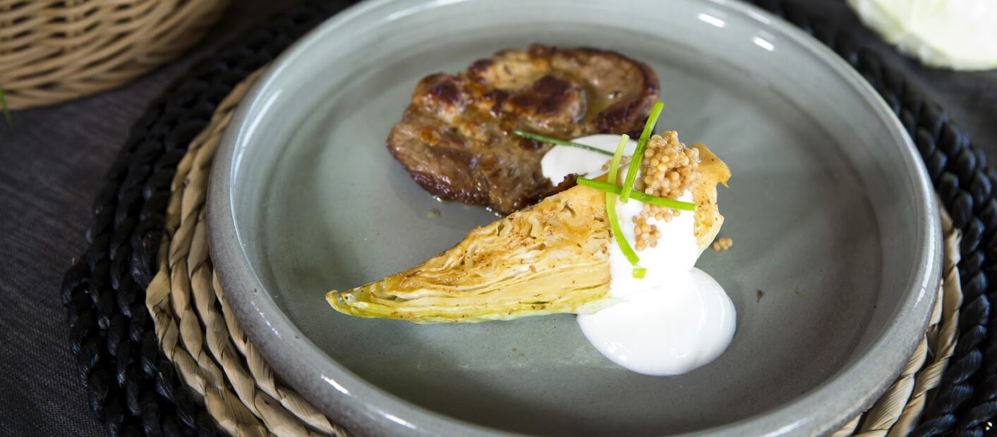 A tejfölt összekeverjük egy csepp citromlével és sóval. A húst a tányérra tesszük, és hozzáadjuk a sült káposztát. A végén hozzáadjuk a fűszerezett tejfölt és az ecetes mustármagot.