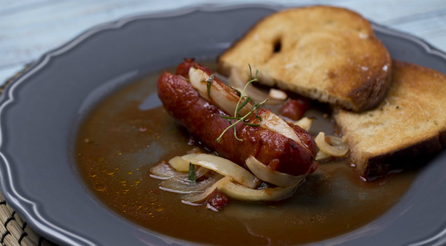A kolbászokat meghámozzuk, bevagdossuk. A vágásokba hagymagerezdeket nyomkodunk. Sütőtálba tesszük a hámozott paradicsomot, ketchupot, szójaszószt, sót, borsot és felöntjük a sörrel. Kanállal alaposan összekeverjük és rászórjuk a félkarikákra vágott hagymát, csíkokra vágott paprikát és kakukkfüvet (ha nincs friss, használjunk szárítottat). Végül rátesszük az előkészített kolbászokat, lefedjük alufóliával és a 200 °C fokra előmelegített sütőben 25 percig sütjük. Ekkor levesszük az alufóliát és még 10 percig sütjük.