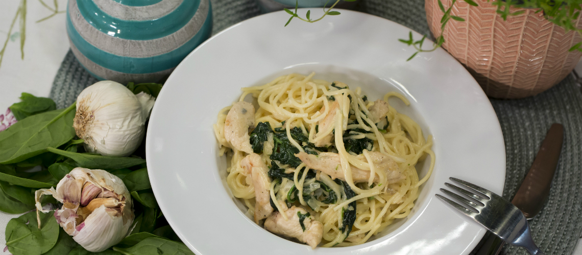 A csirkehúst csíkokra vágjuk, megszórjuk sóval és borssal majd olajon megpirítjuk. Ezután a húst kiszedjük a serpenyőből és a visszamaradt zsiradékon megdinszteljük a hagymát és fokhagymát. A friss spenótot leforrázzuk forró vízzel és hozzáadjuk a dinsztelt hagymát és fokhagymát, felöntjük tejszínnel és hozzáadjuk a reszelt gorgonzolát (kék penészes sajtot). Kicsit összefőzzük, hozzáadjuk a csirkehúst, a főtt spagettit, összekeverjük és kész.