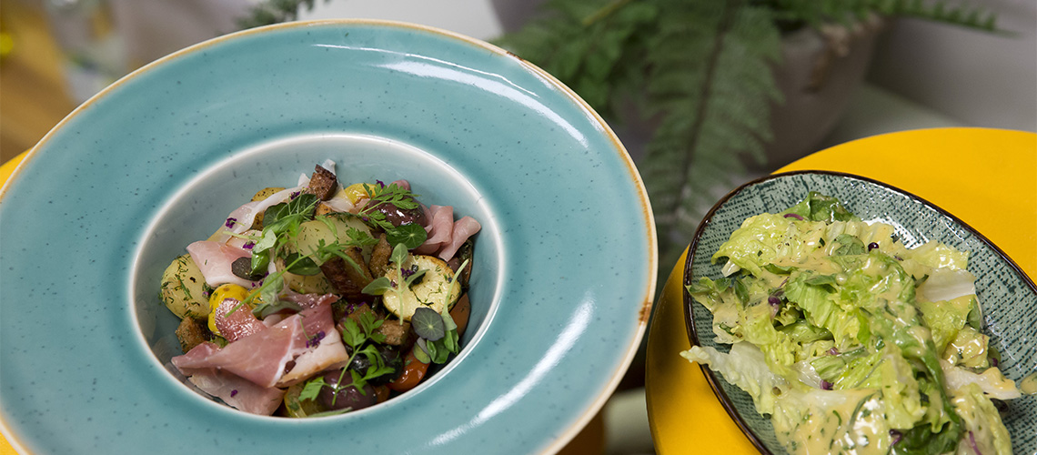 A burgonyát fokhagymával és rozmaringgal kb. 20 percig főzzük, leszűrjük. Vágjuk fel fokhagymát, szeleteljük fel, süssük ropogósra, akárcsak a rozskenyérkockákat. Adjunk hozzá paradicsomot, olívabogyót és a karikára vágott főtt burgonyát, salottát ízlés szerint. Sózzuk, fűszerezzük, olívaolajjal ízesítsük. Rozmaringot és kakukkfüvet keverünk mellé, majd tálaláskor sonkaszeletekkel dobjuk fel.