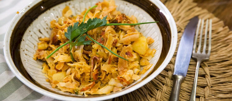 Az oldalast alaposan bedörzsöljük sóval, borssal és köménymaggal együtt összezúzott fokhagymával. A zsírral együtt egy tepsibe tesszük, letakarjuk és 120-130 fokon 3-4 óra alatt puhára sütjük. Félretesszük, még melegen kicsontozzuk és lehűtjük. Egész köményt vízben kiforralunk, majd ezzel a lével öntjük le a vékony csíkokra vágott, sózott és kinyomkodott édeskáposztát és vöröshagymát. Hozzákeverjük a mustárt, esetleg kevés ecetet, némi cukrot. Sózzuk, borsozzuk. A félbevágott baguette-et kevés zsírral megkenjük, beletesszük az ízesített káposztát, az apróra vagdalt hideg sültet és friss petrezselyemmel szórjuk.