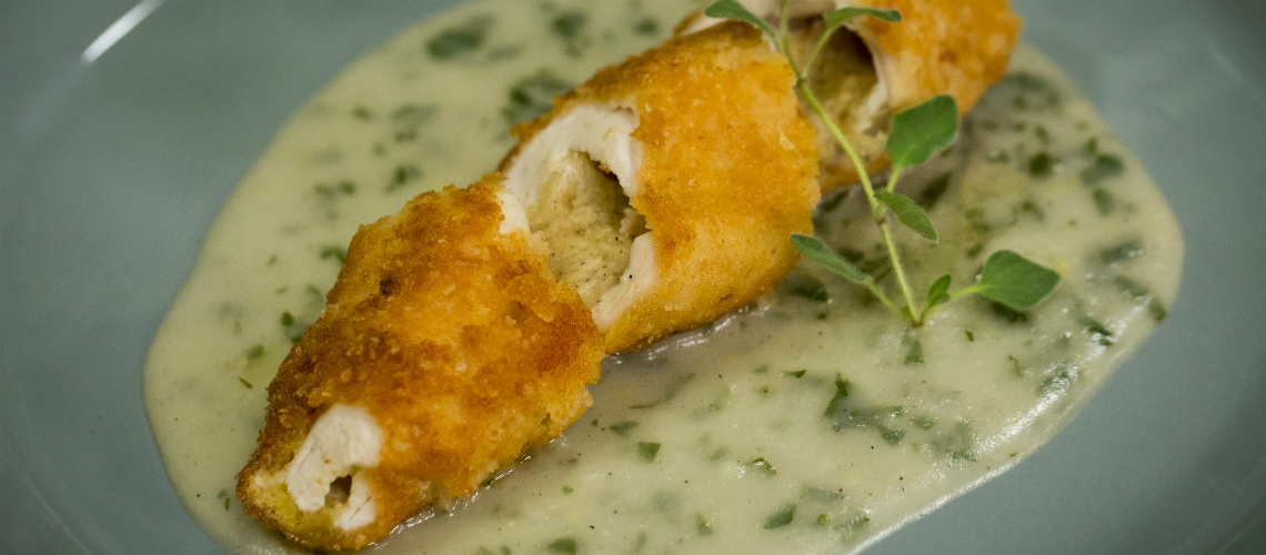 Reszelt sajtot vajjal, sóval, borssal és szerecsendióval összedolgozunk és a felszúrt csirkemellbe töltjük. Lisztbe, tojásba és zsemlemorzsába mártva bundázzuk, majd közepesen forró olajban kisütjük. Vajban lisztet pirítunk, felöntjük húsalaplével, sózzuk, borsozzuk. A mártást citromlével ízesítjük és friss petrezselyemmel szórjuk.