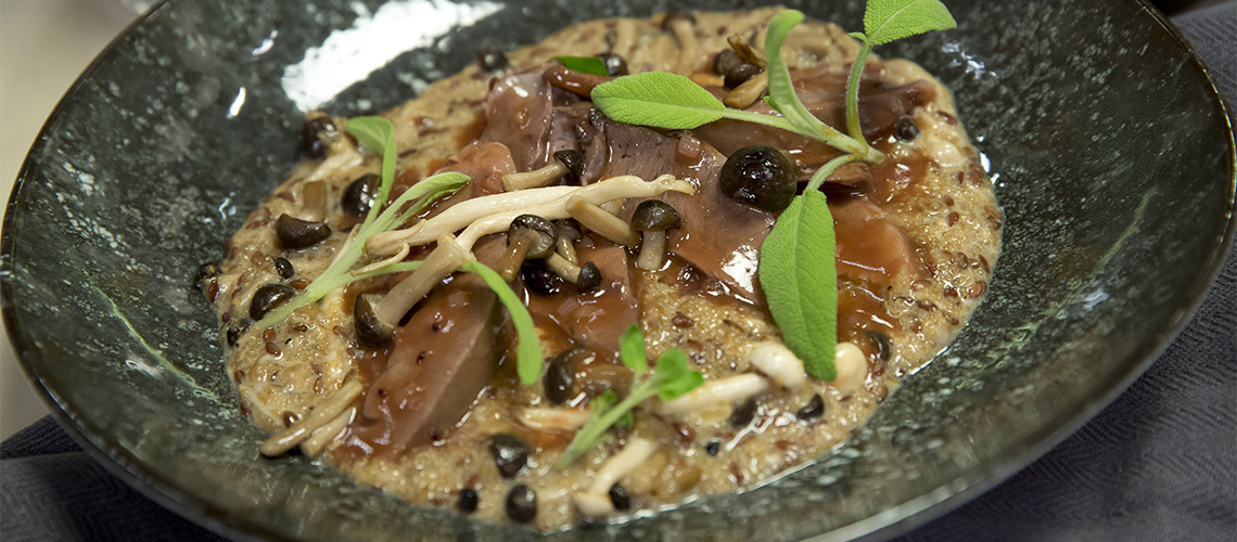 A megfőtt szívet szeletekre vágjuk, és beletesszük a hagymás szószba. A magot száraz serpenyőben megpirítjuk és összetörjük, majd az amaranttal együtt alaplével kásává főzzük. Tegyük hozzá a pirított gombát, a rozmaringmagot és a kakukkfüvet, majd vajjal krémesítjük. Szívvel, gombával és turbolyával tálaljuk.