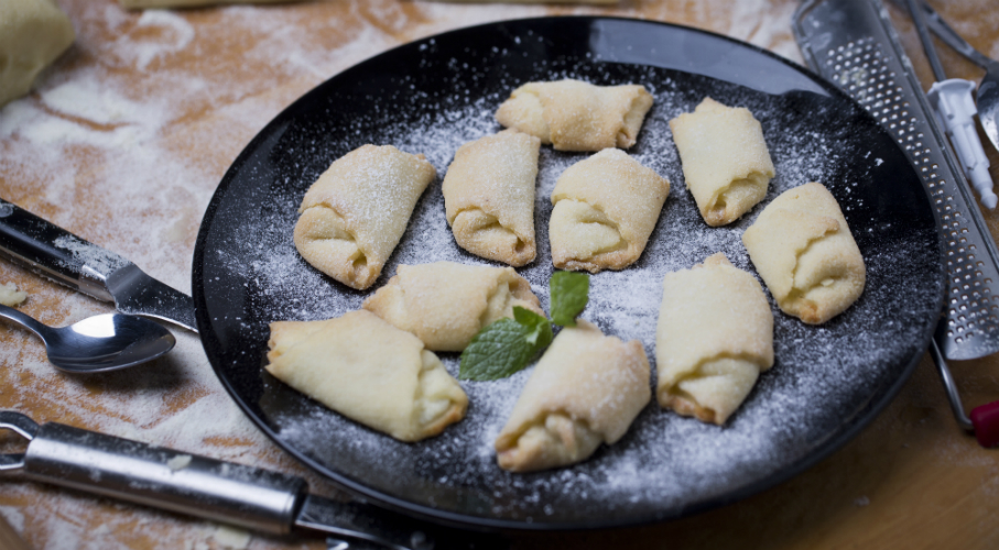 Először elkészítjük a túrós tölteléket. A hozzávalókat simára keverjük. A tésztához a 3 összetevőt összekeverjük, és simára gyúrjuk, majd 7 részre osztjuk. Mindegyik darabból 27-30 cm átmérőjű kört nyújtunk, amit 8 cikkre vágunk. A háromszögek alapjára teszünk egy gombócot a túrós töltelékből, a széleket behajtjuk, majd a csúcs felé feltekerjük. A batyukat csúcsukkal felfelé a sütőpapírral kibélelt tepsire helyezzük, és 180 °C fokos sütőben világosra sütjük. Amikor kész, megszórjuk porcukorral. Frissen finom ropogós, később a túrótölteléktől kissé átpuhul a tészta.
