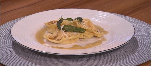 TOJÁSSÁRGÁJÁVALTÖLTÖTT RAVIOLI BARNÍTOTTT VAJJAL, PIRÍTOTT ZSÁLYALEVÉLLEL