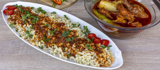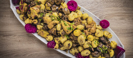 Lármás tyúkpörkölt tányérról szaggatott petrezselymes nokedlivel és roma salátával