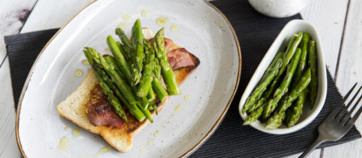Zöld spárga glasszírozott mézes sonkával fűszeres pirítóssal