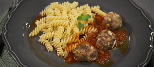 Húsgombócok paradicsommártásban, tészta