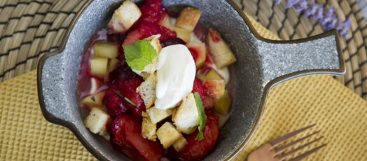 Almakompót pácolt szilvával, krémsajttal és krutonnal