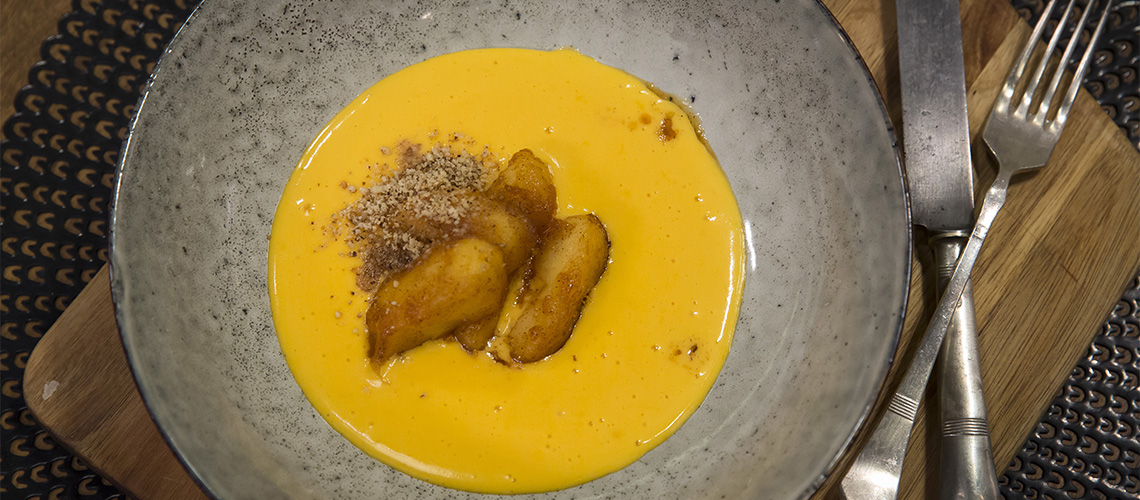 Vízfürdő fölött keverjük össze a tejszínt, a tojássárgáját, a cukrot és a vaníliakivonatot, addig, amíg sűrűsödni kezd. Ízlés szerint csepegtessük bele rumot is. Az almát meghámozzuk és citromos vízbe áztatjuk. Ezután egy serpenyőben karamellt készítünk, majd beleforgatjuk az almát. Tehetünk bele apróra vágott diót, mazsolát is. Ízlés szerint még adhatunk hozzá rumot, amivel flambírozzuk. Tálalás előtt felverjük a tejszínt, összeforgatjuk az angolkrémmel tálaljuk.