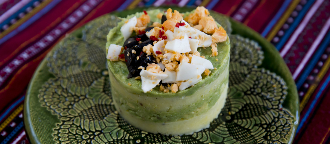 A burgonyát sós vízben megfőzzük, leszűrjük, és krumplinyomóval áttörjük. Hozzáadjuk az olívaolajat, a citromhéjat és a citromlevet, sózzuk, borsozzuk. Összekeverjük az avokádós töltelék hozzávalóit. Két fémkarikában, vagy egy téglalap alakú jénaiban rétegezzük: először citromos tört burgonya, rá avokádó, ismét burgonya, vékony réteg tört avokádó, végül még egy vékony réteg burgonyapüré a tetején. Tálaláskor a tetejét megszórjuk apróra kockázott főtt tojással és finomra aprított fekete olajbogyóval. Hidegen kínáljuk, előételként.