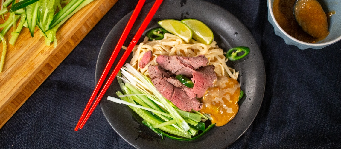 A húst bepácoljuk a reszelt gyömbér, finomra aprított fokhagyma, szójaszósz és 1 evőkanál lime levének keverékébe. 1 óra múlva leitatjuk a pácot a steakről, majd felforrósítunk egy serpenyőt és 1 evőkanál olajon körbe pirítjuk a húst. 160 fokra előmelegített sütőbe tesszük és 15 percig sütjük, majd alufóliába csomagolva pihentetjük 10 percet mielőtt felszeletelnénk.