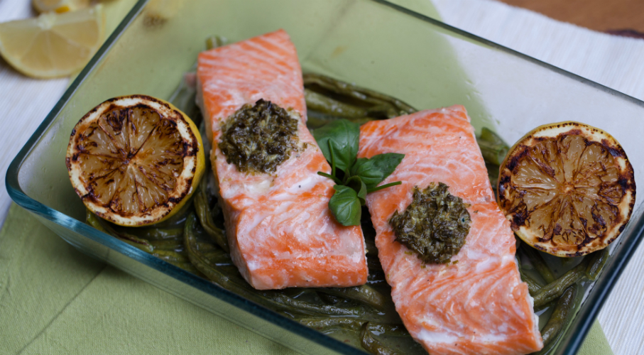 A sütőt 200 fokra előmelegítjük. Egy tálban összekeverjük a fűszervaj hozzávalóit. A keveréket műanyag fóliába csomagoljuk, hengerré formázzuk, majd egy kis időre a fagyasztóba tesszük. A zöldbabot egy sütőtálba tesszük, meglocsoljuk olívaolajjal, felöntjük az alaplével és megfűszerezzük. A sütőben 5 percig sütjük. A forró zöldbabot összekeverjük majd ráfektetjük a sózott lazacfiléket. A fűszervajból karikákat vágunk és a hal tetejére tesszük. Újabb 10-12 percig sütjük. Baguette-tel és fehérborral kínáljuk.